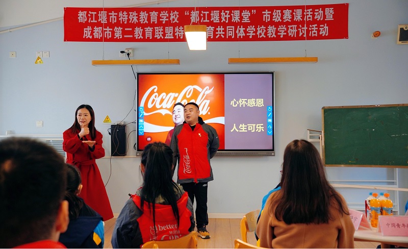 弘扬榜样精神,凝聚奋进力量。活动现场,中粮可口可乐青年志愿者代表——“可乐男孩”薛枭以四川省励志宣讲团代表的身份作新时代残疾人的励志主题分享,用亲身经历诠释残疾人在职场和社会中的无限可能,鼓舞着学生们向前奔跑。师生代表也通过手语表演讲述特殊学生的成长故事,和志愿者们一起分享他们的成长收获,正式开启校企共融活动,活动在一片祥和、欢乐的氛围中进行。